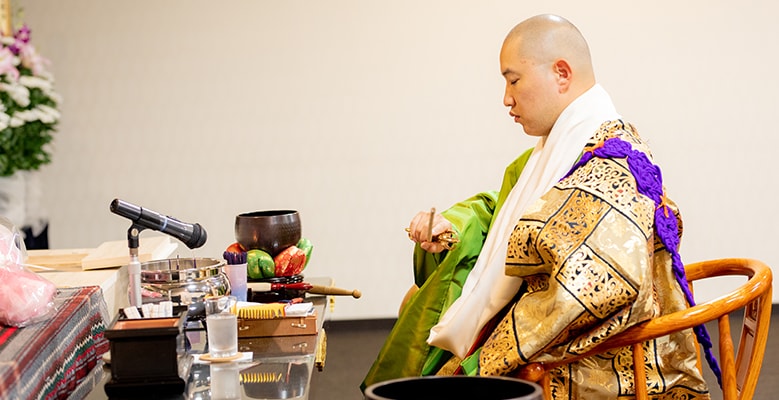 ご葬儀において基本的な流れとしましてお通夜、ご葬儀を通じて故人様に感謝を表し、お浄土に導いて頂けますよう阿弥陀経、法華経、お念仏、歴代継承の引導作法にてお勤め致します。